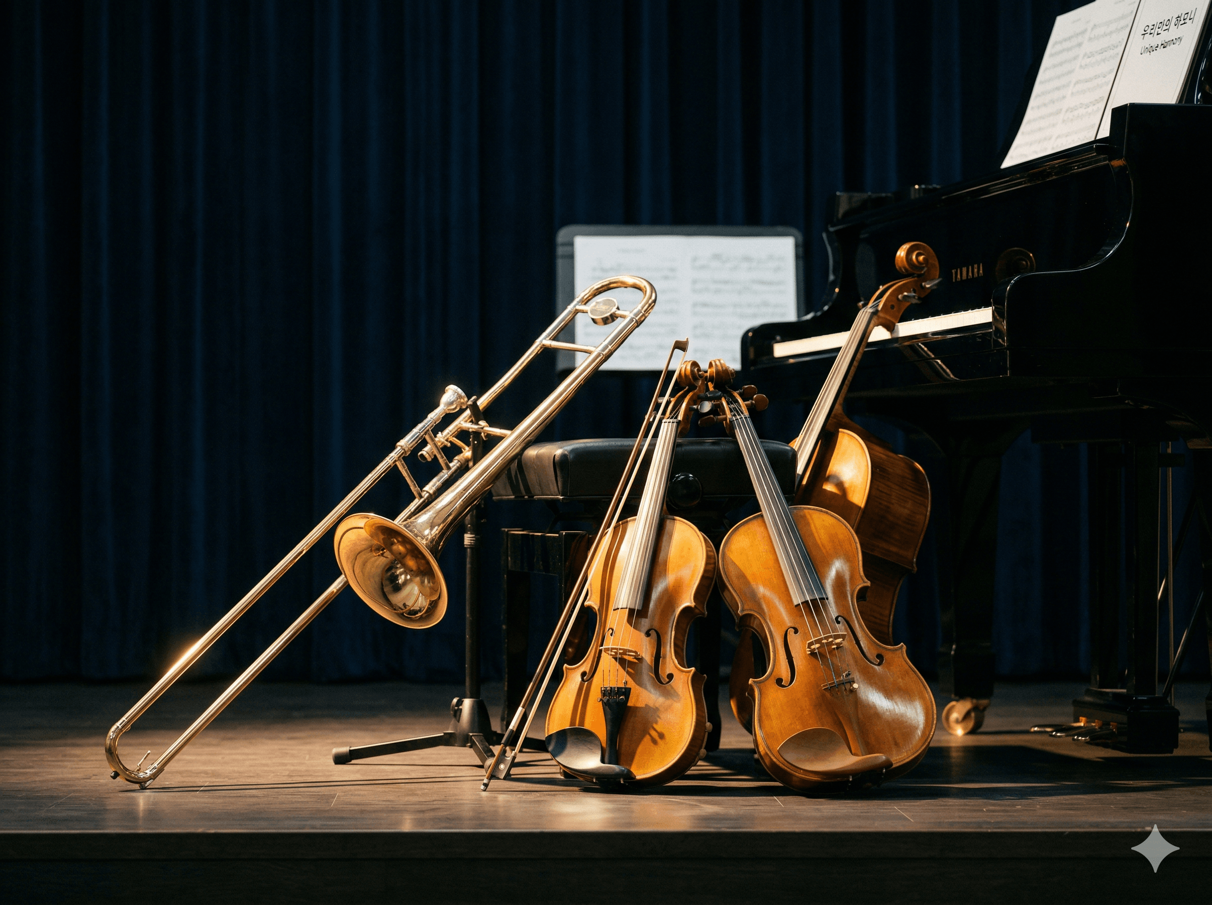 트롬본, 바이올린, 비올라, 피아노 — 흔치 않은 다양한 악기들로 구성되어 있고, 시간에 구애받지 않고 여러분께 자유롭게 찾아갈 수 있다는 점이 저희만의 매력입니다.